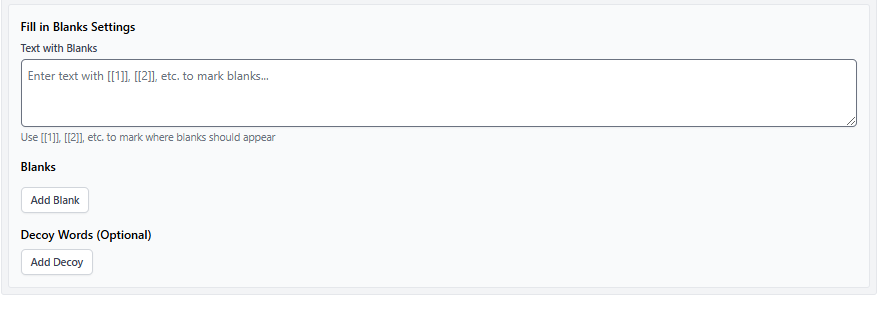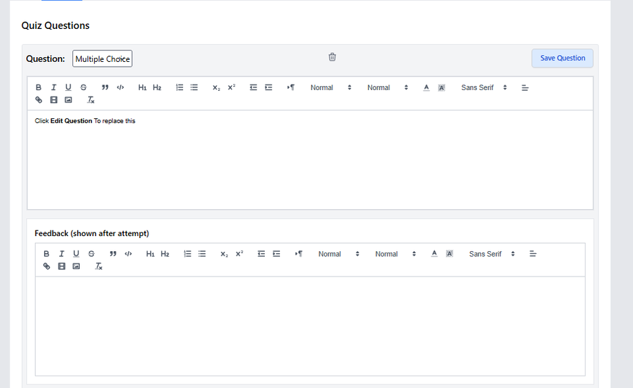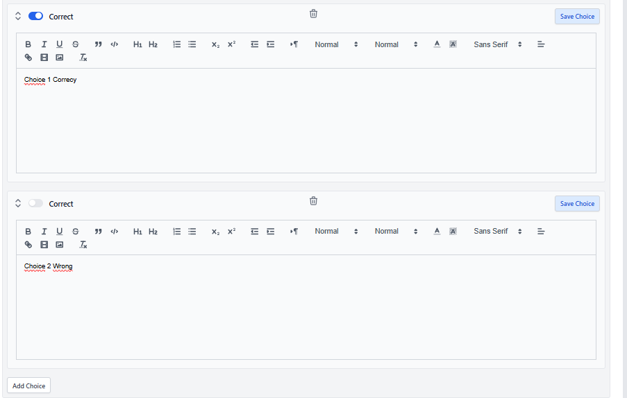 - Multiple Choice (MCQ): Enter the question, choices, and correct answer.